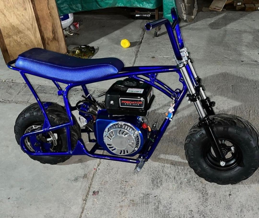 Custom-built mini bike finished in a striking metallic blue. Features a durable tubular steel frame, matching blue seat, and wide off-road tires for excellent traction. Powered by a reliable Predator engine, this bike delivers strong performance and easy maintenance. Equipped with front suspension forks, sturdy handlebars, and a compact, lightweight design that makes it fun and responsive to ride. Perfect for trail riding, yard cruising, or as a standout pit bike. Built solid and looks just as good as it runs.